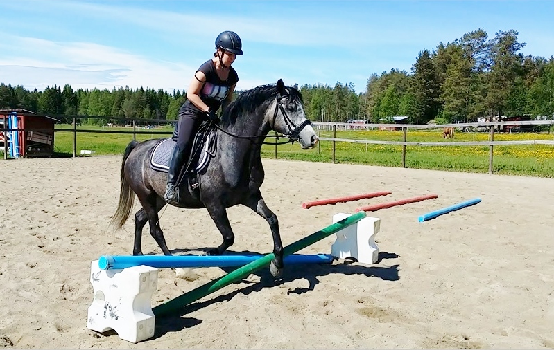 Tyvärr så skadade sig Galishimo när jag skulle låta honom ta krysset på vanlig lina igen. Han blev rädd och slängde sig åt sidan och skrapade upp flera decimeter av insidan på sitt ben, och började blöda. Då avbröt jag träningen och har väntat på att skrapsåret ska läka ordentligt. Sedan fokuserade jag på dressyr och att kunna rida ut med honom i naturen i stället. Nu har jag även köpt benskydd så olyckan inte ska hända igen. Men det gick hyfsat bra på slutet. Denna video var den sista som jag filmade från hans träning. Det är Elin som rider!