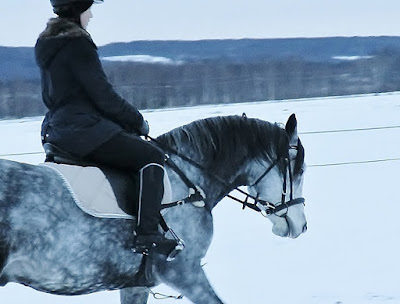 Jag red Galishimo både igår och idag. Många är ju jullediga så det har varit ungar på gården. Hundar har sprungit runt i stallet. Både kända och okända hästmänniskor besöker stallet och sina vänners hästar. De går in i hagarna och hälsar på de olika hästflockarna. Barn bygger snökojor och jagar varandra. Alldeles vid fältet röjer någon skogen med motorsåg. Rådjuren springer över fältet som i pärlband, i långsam galopp. Skotrar och fyrhjulingar passerar. En äldre man går efter rådjuren med en famn hö så de klarar vintern. Ett barn leker med bommar i bomhuset så det väsnas. Kända och okända människor rider på ridbanan. Det har varit ganska idylliska dagar att åka till stallet på lunchen och rida lite. Och Galishimo har faktiskt hanterat det mesta alldeles utmärkt. Han har inte ens varit nervös. Han har varit lat. När vi skrittat ut på fältet har han sett ut att sucka och säga "Igen?! Ska vi galoppera här IGEN?!" och sedan har han... milt uttryckt... sparat på krafterna när vi...