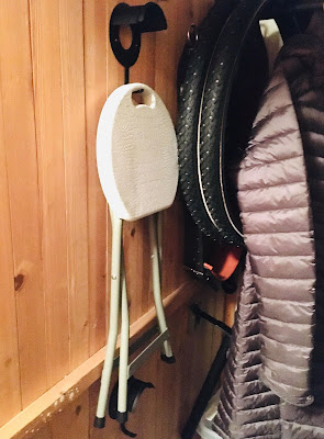 Jag fick ett tips från en stallkompis förra året om att det finns en liten stol från JULA som jag kan hänga upp, och enkelt vika ut och stå på, om jag vill plocka fram prylar från den översta hyllan. Jag har även köpt en sådan till stallskåpet så jag kan sitta på den när jag rengör träns och annat. Det blir bra! Livet ska vara lätt.