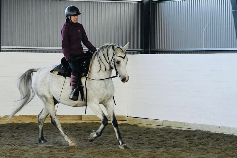 Jag måste ha låga händer och be honom sänka sig så han inte går med huvudet uppåt och börjar bromsa och vingla. Men det blir helt okej galoppträning. Det är också väldigt viktigt att hålla i sig när man skrittar efteråt, för det är då han kan börja tänka och kan skygga lite mer. Jag kunde galoppjobba honom under tiden som någon svetsade en bit bort, för några dagar sedan, så han börjar vänja sig vid att det kan komma alla möjliga ljud i ridhuset. Han är fortfarande lite rädd för ridhusväggen och ljuden och skuggorna när man rider nära väggen, men jag tänker inte så mycket på det, utan låter honom gå 50 cm innanför spåret och berömmer honom när han är avspänd över det. Det kommer att lösa sig.